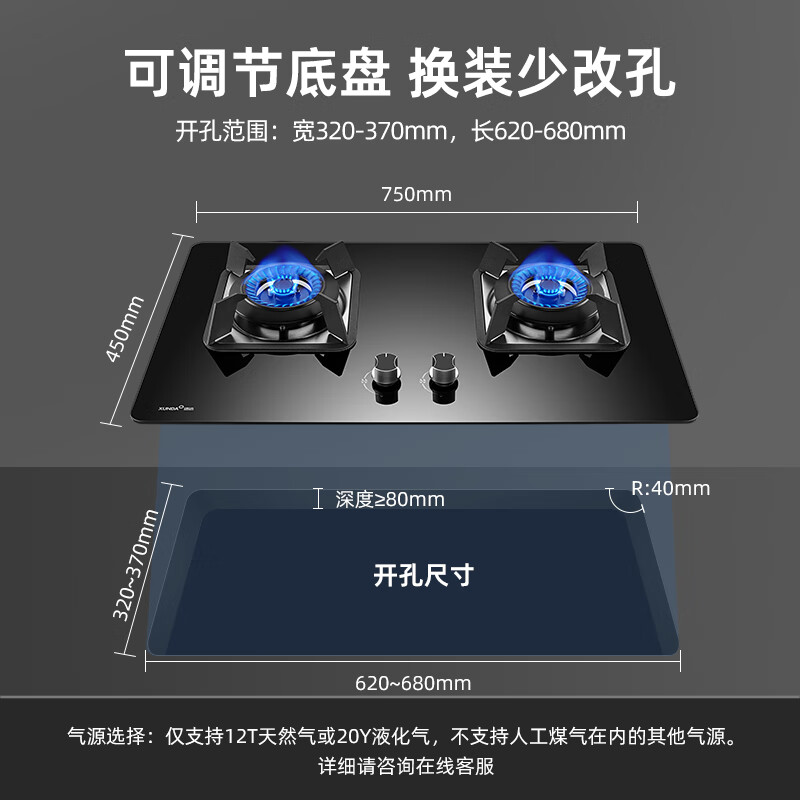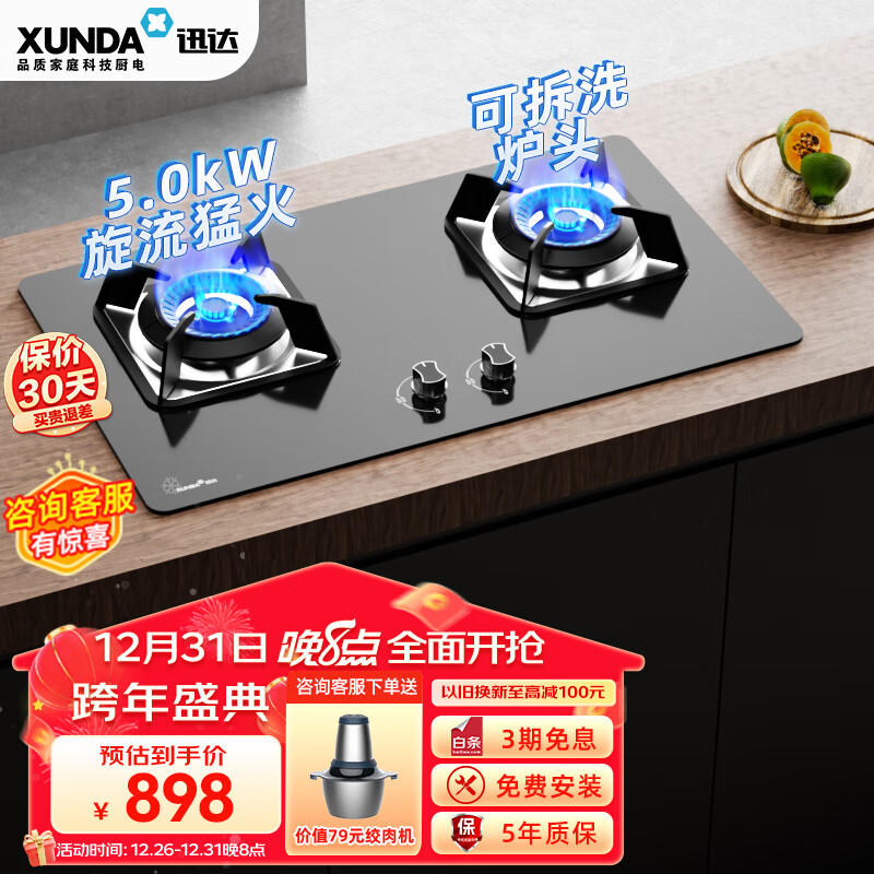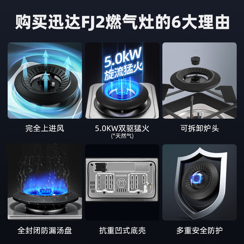 迅达(XUNDA)燃气灶天然气灶家用 双灶具灶台 嵌入式台式两用 5.0KW旋流猛火灶 可拆卸炉头 FJ2-天然气价格:998.00元!