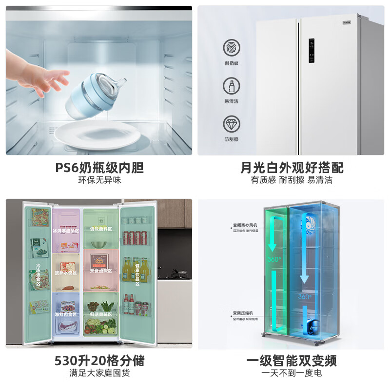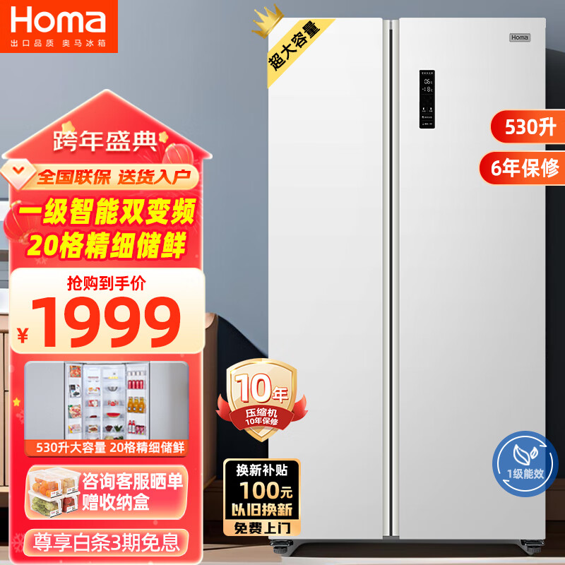 奥马(Homa)530升大容量双变频一级能效风冷无霜双开门对开门白色家用电冰箱 -25深冷速冻 BCD-530WKH/B价格:2099.00元!