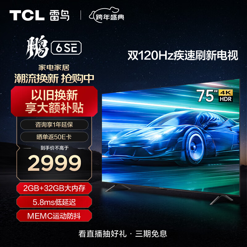 TCL雷鸟 鹏6SE 75英寸游戏电视 MEMC防抖 4K超高清屏 2+32GB 巨幕网络智能电视机以旧换新75S365C价格:2999.00元!