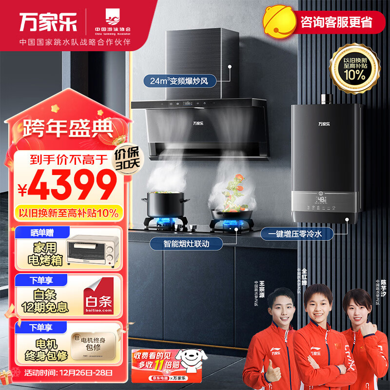 万家乐 抽油烟机 24m3/min顶侧三腔变频静音烟灶联动13L零冷水烟灶热三件套装TAK8+KV063B+13DL1天然气价格:4499.00元!