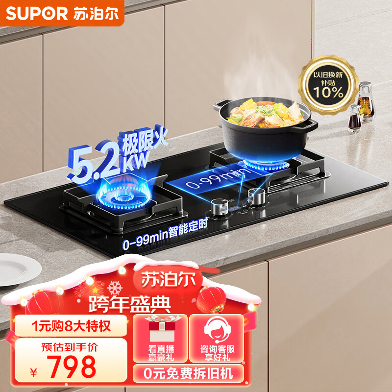 苏泊尔(SUPOR)燃气灶双灶家用 天然气双灶具5.2kW猛火大火力 嵌入式台式两用灶台 智能定时 全进风DB2Z7S天价格:798.00元!