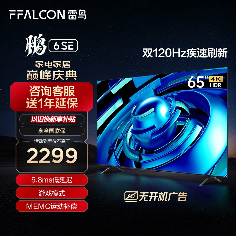 FFALCON雷鸟 鹏6SE 65英寸游戏电视 4K超薄屏 MEMC防抖 远场语音 2+32G 平板电视机65S365C[黑]价格:2299.00元!