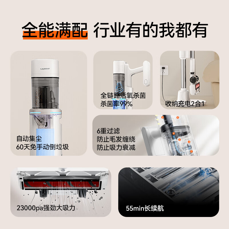 uwant友望吸尘器家用无线手持 巨幕绿光显尘 智能自集尘基站 双尘杯毛发防缠绕 60天免打理尘袋V200价格:1999.00元!