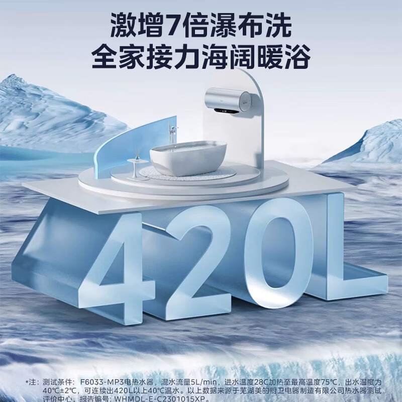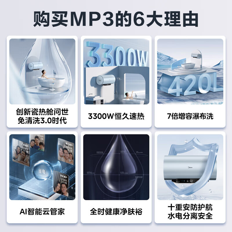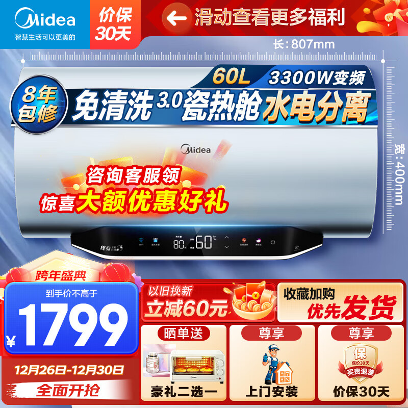 美的(Midea)60升家用储水式电热水器水电分离一级能效3300W速热7倍增容10重安防免洗瓷热舱F6033-MP3(HE)价格:1799.00元!