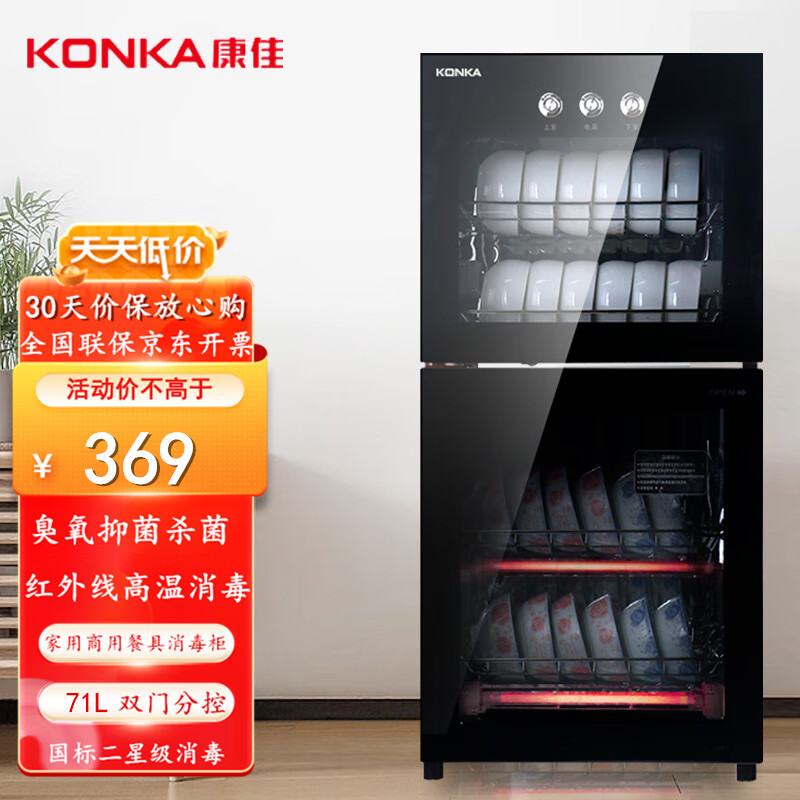 康佳(KONKA)商用消毒柜消毒碗柜立式家用臭氧杀菌红外线高温消毒71L双门ZTP138K22价格:399.00元!