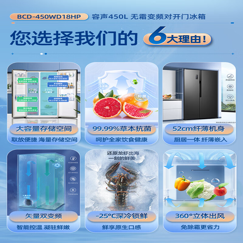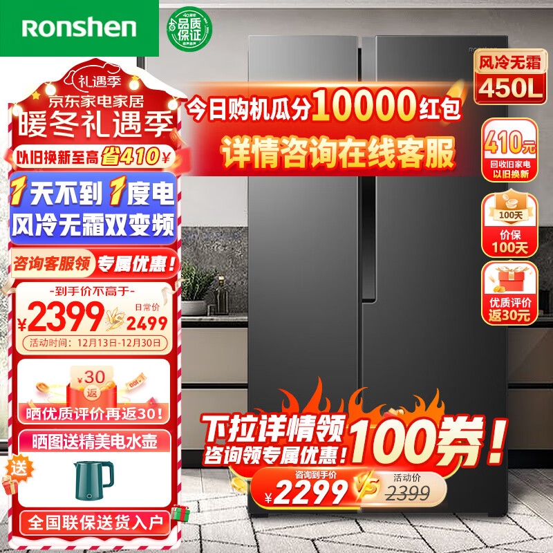 容声(Ronshen)450升冰箱全时双驱变频双开门对开门风冷净味养鲜纤薄家用大容量BCD-450WD18HP价格:2399.00元!