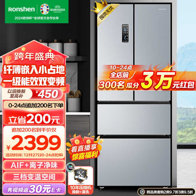容声(Ronshen)319升变频一级能效法式多门四开门冰箱家用风冷无霜超薄大容量BCD-319WD11MP三档调温价格:2599.00元!