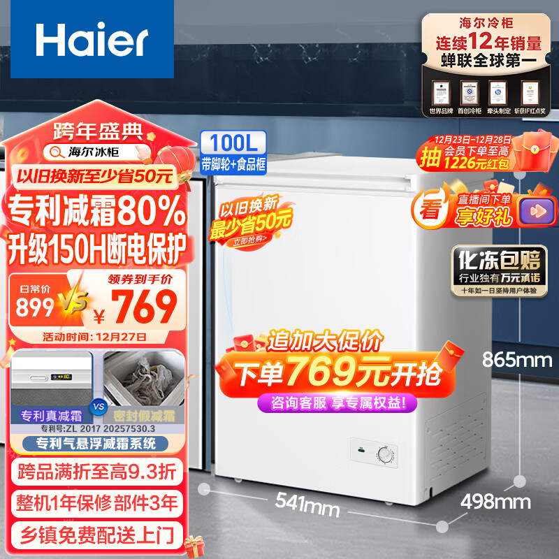 海尔(Haier)100升低霜小冰柜家用商用 冷藏柜冷冻柜两用冰柜小型租房用小冰箱小型冷柜BC/BD-100GHDT 以旧换新价格:799.00元!