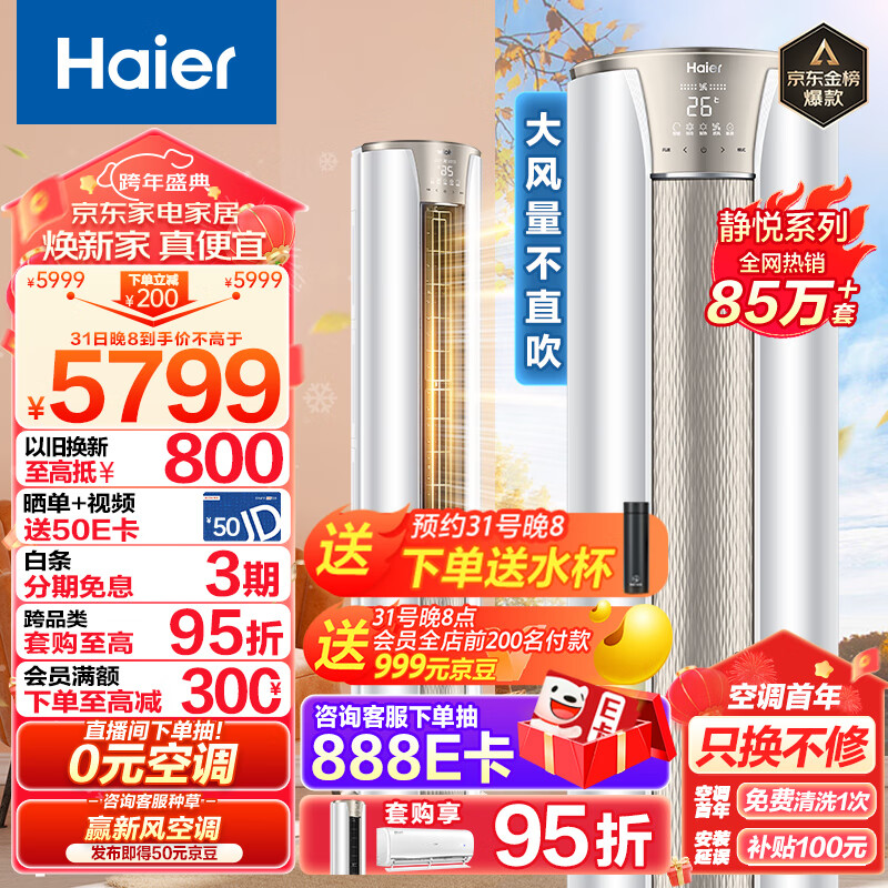 海尔(Haier)3匹 静悦新一级变频省电客厅空调立式柜机 京东小家智能 KFR-72LW/28KCA81U1(冰雪白) 以旧换新价格:5999.00元!