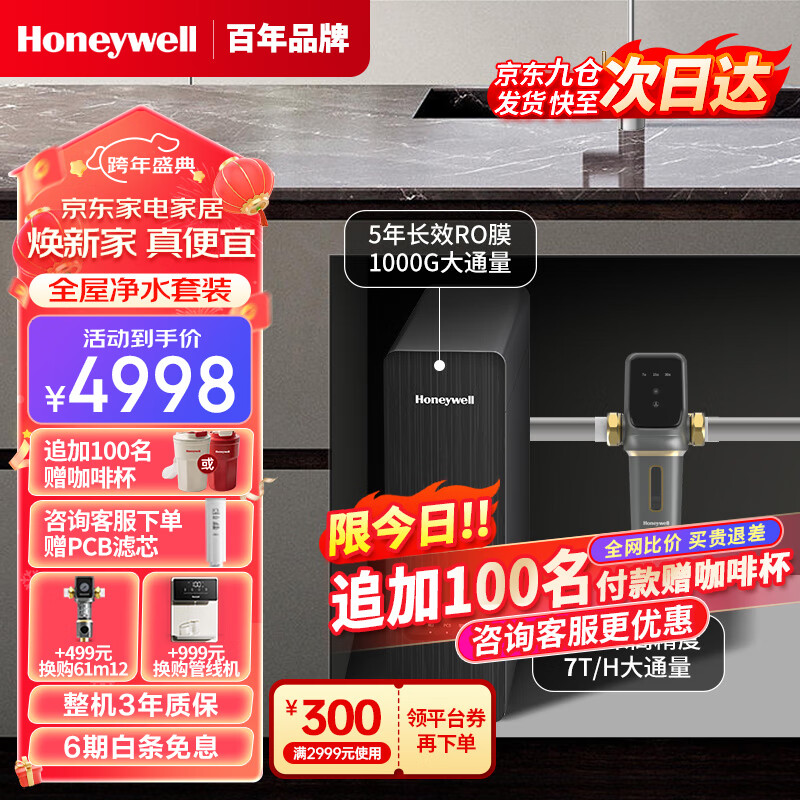 霍尼韦尔(Honeywell)贝加尔系列全屋净水器套装家用厨房直饮净水机RO反渗透纯水机1000G大通量+全自动前置过滤器价格:5298.00元!