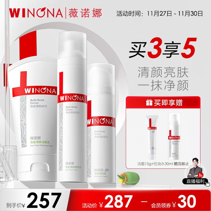 薇诺娜净痘清颜洗面奶+爽肤水+面霜水乳男士护肤品套装化妆品价格:287.00元!