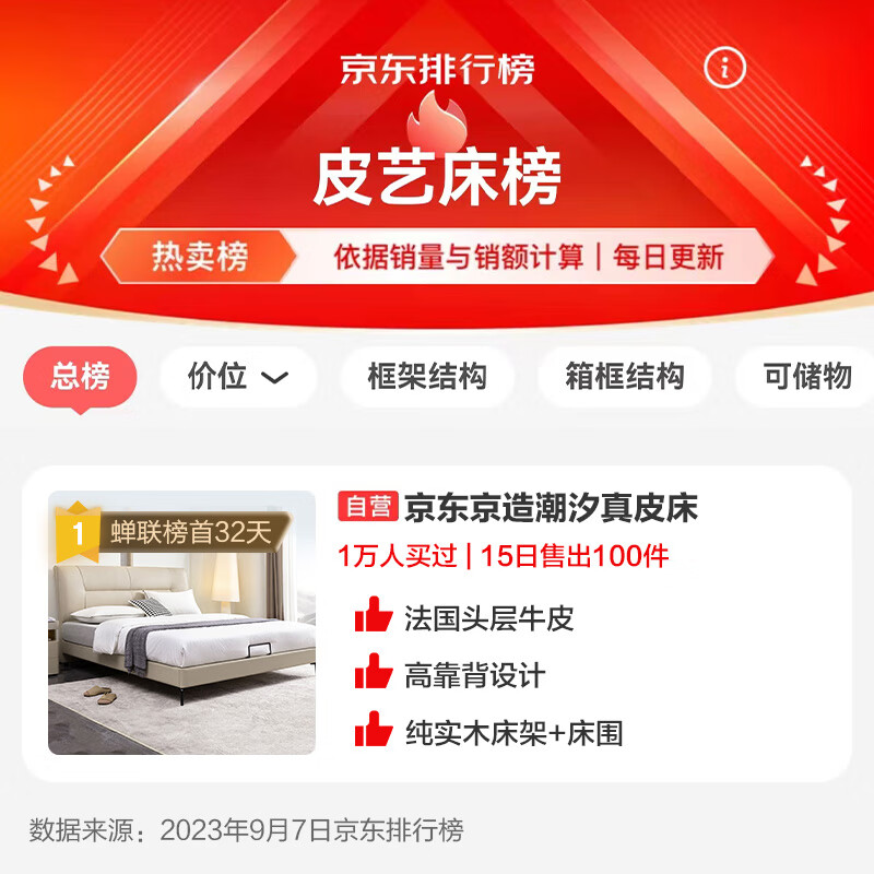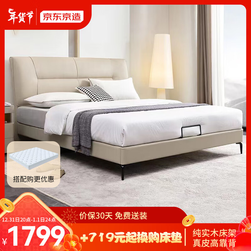 京东京造真皮床 头层牛皮|高靠背床头|纯实木床架 主卧双人床1.8×2米BL13价格:2099.00元!