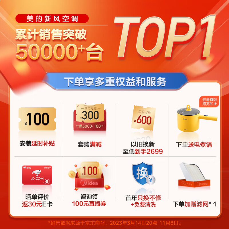 美的(Midea)新风空调 大1匹 静新风 新一级能效 变频冷暖 壁挂式智能空调挂机 KFR-26GW/N8XF1-1定制版价格:2999.00元!