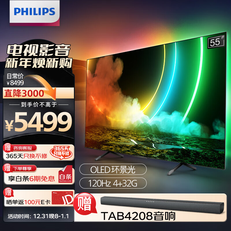 飞利浦(PHILIPS)55英寸OLED 4K屏环景光流光溢彩 120Hz 4+32G杜比全景声智慧护眼平板电视机55OLED786/T3价格:5499.00元!