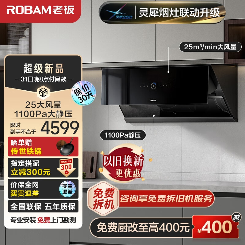 老板(Robam)【灵犀烟灶联动升级】抽油烟机智能变频25风量侧吸式油烟机家用大吸力全自动吸油烟机29X8S烟机价格:4599.00元!