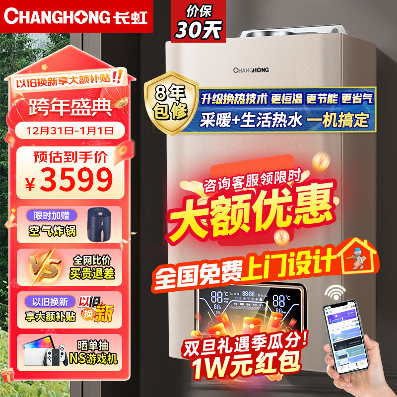长虹(CHANGHONG)燃气壁挂炉家用天然气双温双控供暖淋浴APP智控多段式燃烧锅炉供暖暖气地暖热水两用恒温28BQ01价格:3599.00元!