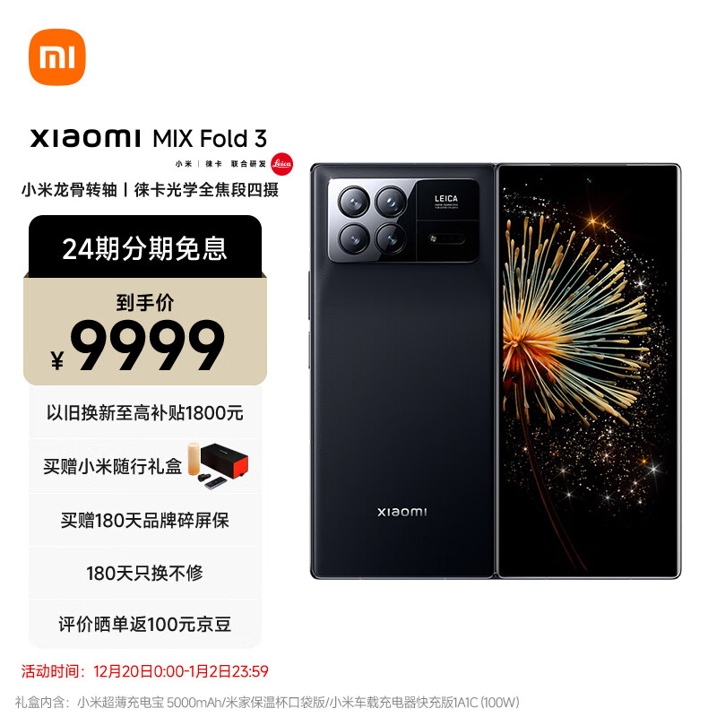 Xiaomi MIX Fold 3 小米龙骨转轴 徕卡光学全焦段四摄 双E6旗舰屏幕 16GB+512GB 月影黑 小米折叠屏手机 5g价格:9999.00元!