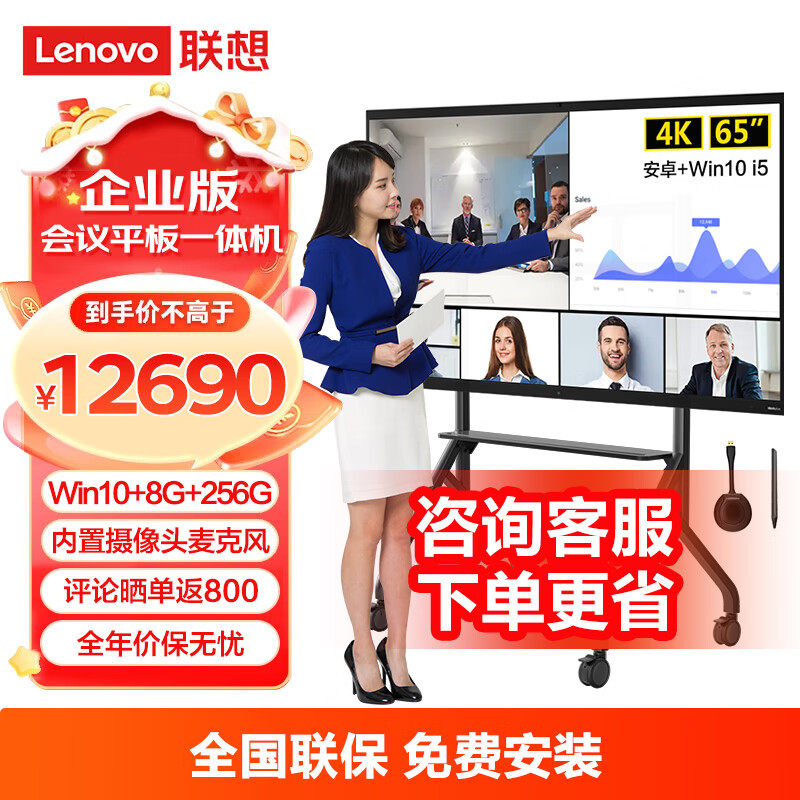 联想thinkplus会议平板一体机65英寸电子白板视频会议电视触摸显示屏S65Pro+传屏+支架+Win10电脑模块价格:12690.00元!