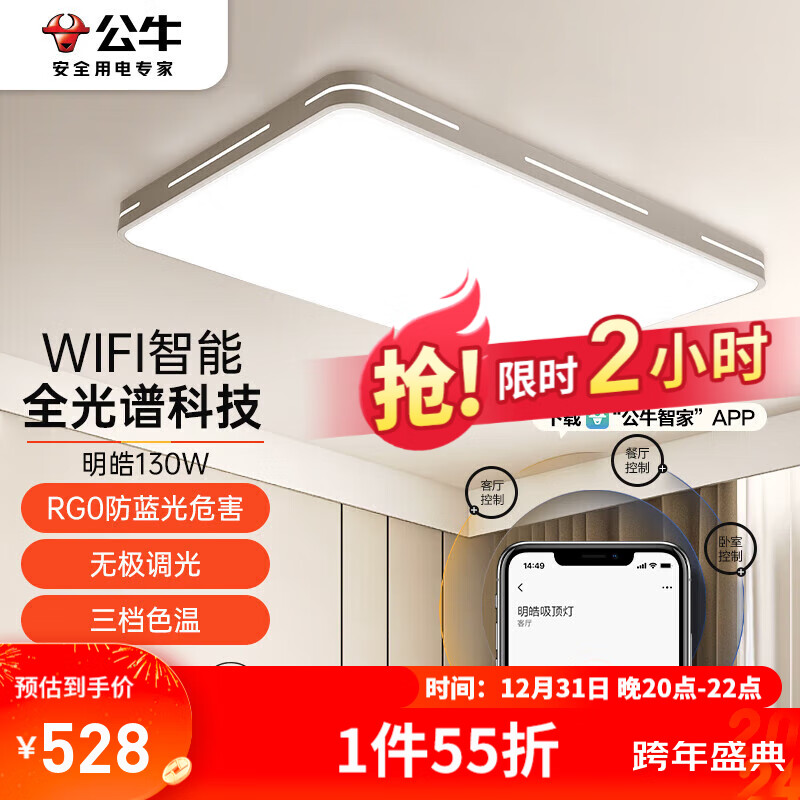公牛(BULL)LED吸顶灯智能WIFI全光谱MX-C130E-WS明皓客厅灯无极调光130W价格:948.50元!