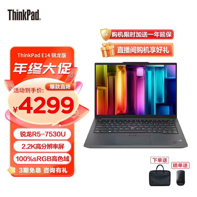 ThinkPad 联想 E14 2023锐龙版 14英寸 商务办公轻薄笔记本电脑 R5-7530U 16G 512G 2.2K 0U价格:4299.00元!