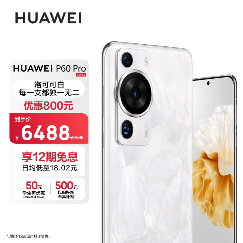 华为/HUAWEI P60 Pro 超聚光夜视长焦 昆仑玻璃 双向北斗卫星消息 12GB+256GB 洛可可白 鸿蒙智能旗舰手机价格:6188.00元!