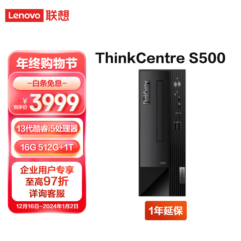 联想台式机ThinkCentre S500 13代酷睿 商用办公家用学习台式电脑全套整机 i5-13400 16G 512固1T机械单主机价格:3999.00元!