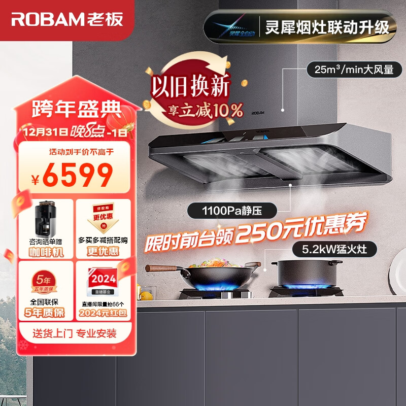 老板(Robam)【灵犀烟灶联动升级】抽油烟机欧式顶吸双腔变频25风量燃气灶吸油烟机灶具套装63A3S+57B6D天然气价格:6598.00元!