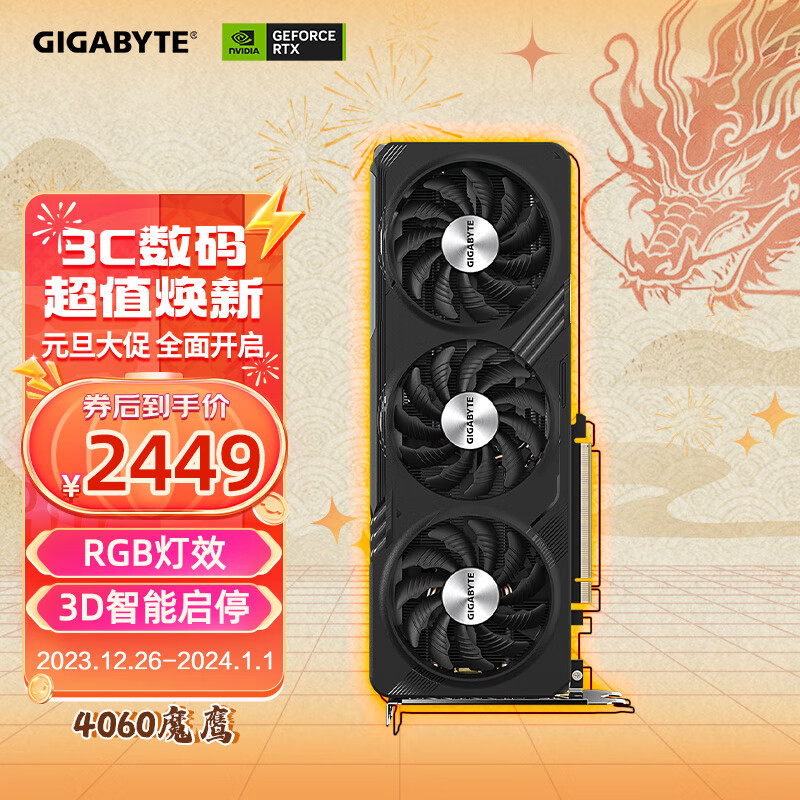 技嘉(GIGABYTE)魔鹰 GeForce RTX 4060显卡 Gaming OC 8G DLSS 3 电竞游戏设计电脑独立显卡支持2K/4K价格:2599.00元!