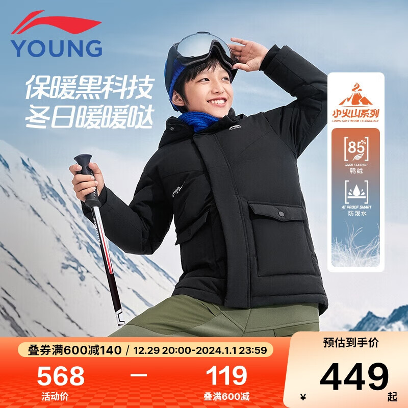 李宁YS李宁童装儿童羽绒服男小大童85%鸭绒连帽按扣口袋工装羽绒服价格:568.00元!