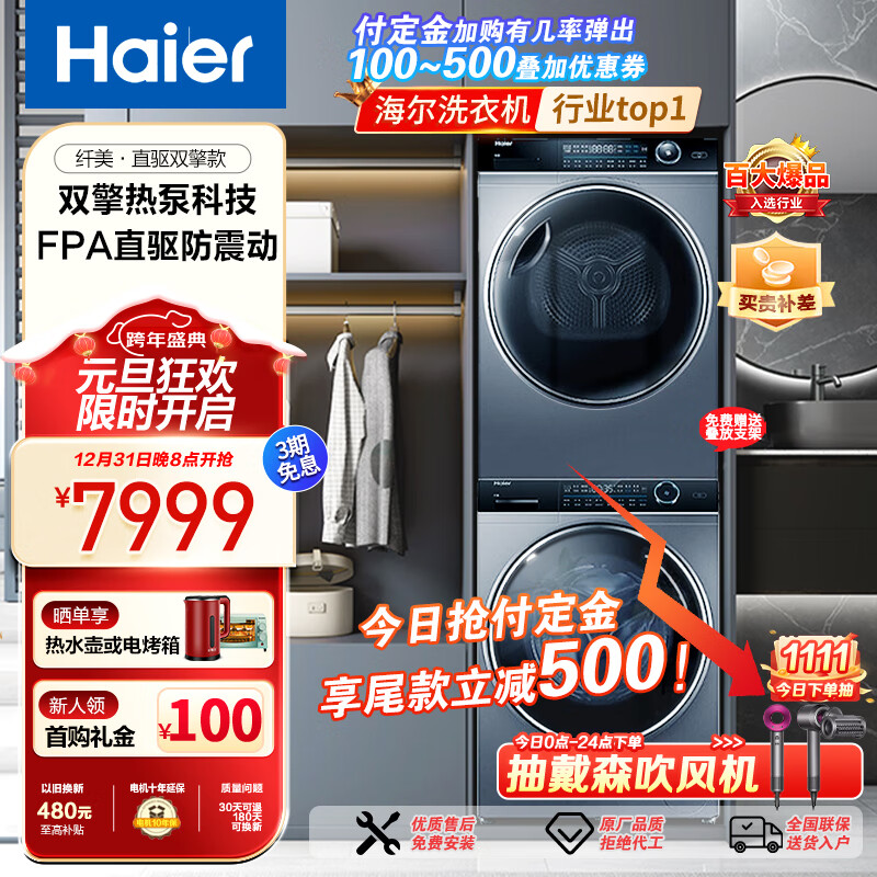 海尔(Haier)纤美双擎热泵10Kg洗烘套装 全自动洗衣机烘干机 超薄直驱变频 智能投放正反转176洗烘套以旧换新价格:7999.00元!