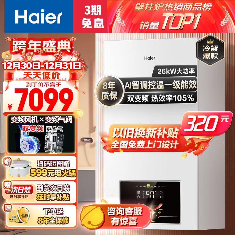 海尔(Haier)双变频一级能效冷凝燃气壁挂炉天然气采暖炉热水器板换式地暖暖气片五点恒温LL1PBD20-JN7(T)U1价格:7043.33元!