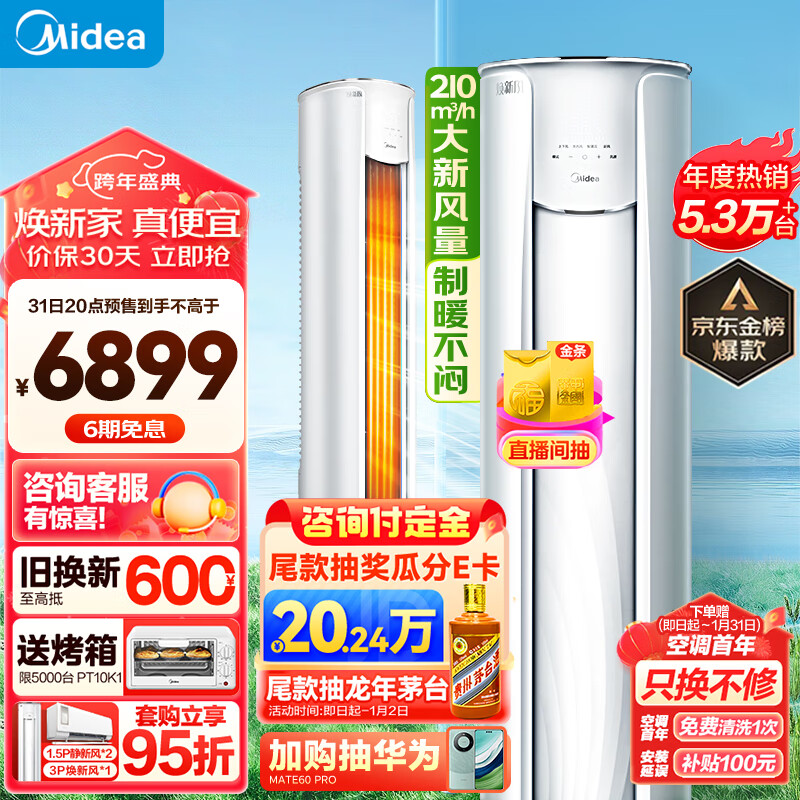 美的(Midea)2匹新风空调新风量210m3/h焕新风新一级变频冷暖客厅立式柜机KFR-51LW/N8MKA1A价格:6899.00元!