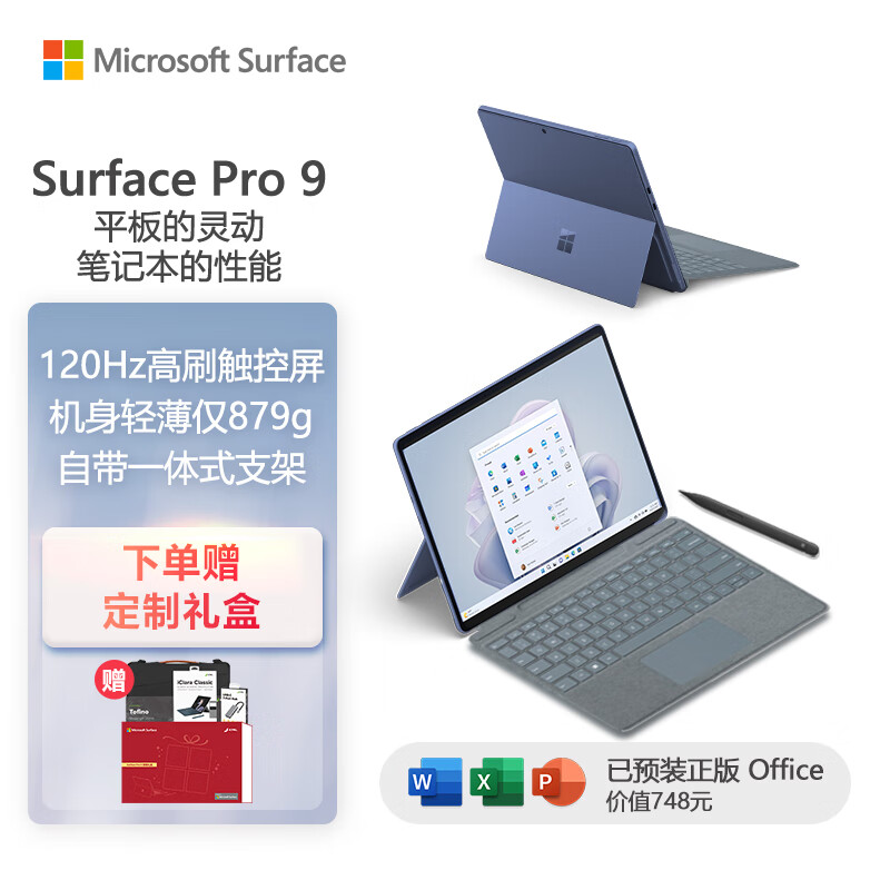 微软Surface Pro 9 宝石蓝+冰晶蓝带触控笔键盘盖 i5 8G+256G 二合一学生平板 13英寸120Hz触控屏 笔记本电脑价格:8788.00元!