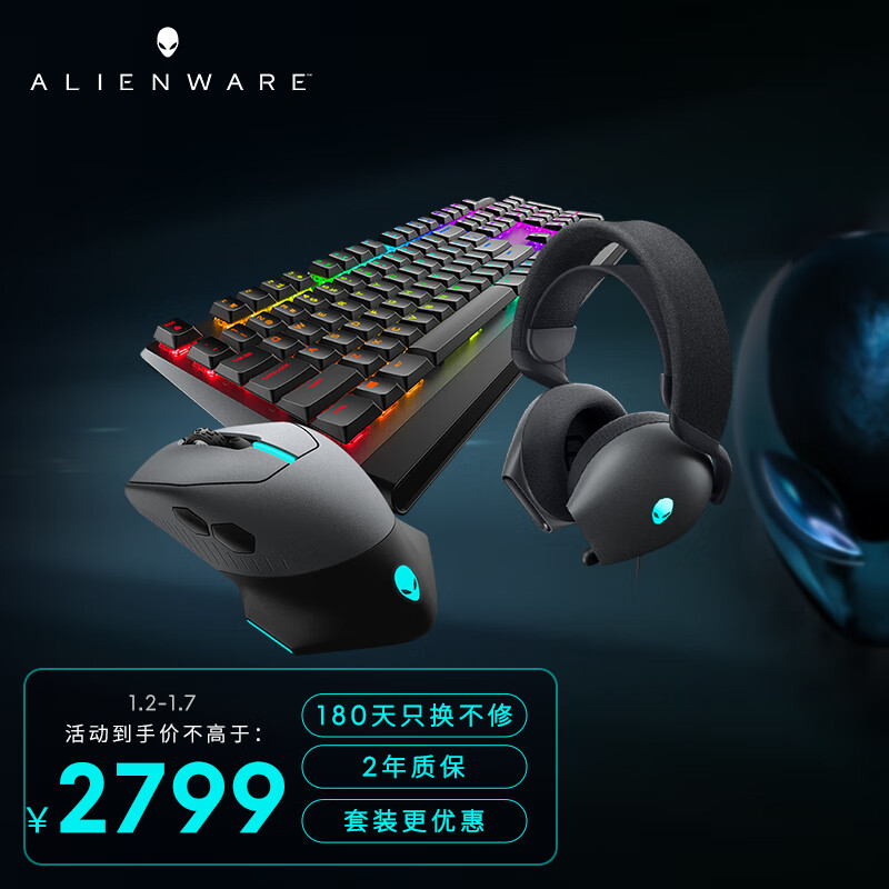 外星人(Alienware)610M+510K+520H电竞三件套(无线游戏鼠标 有线机械键盘 电竞耳机)RGB高端外设送礼物黑色价格:2799.00元!