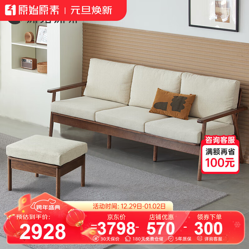 原始原素实木沙发北欧橡木冬夏两用现代简约沙发黑胡桃色米色三人位+脚踏价格:3798.00元!
