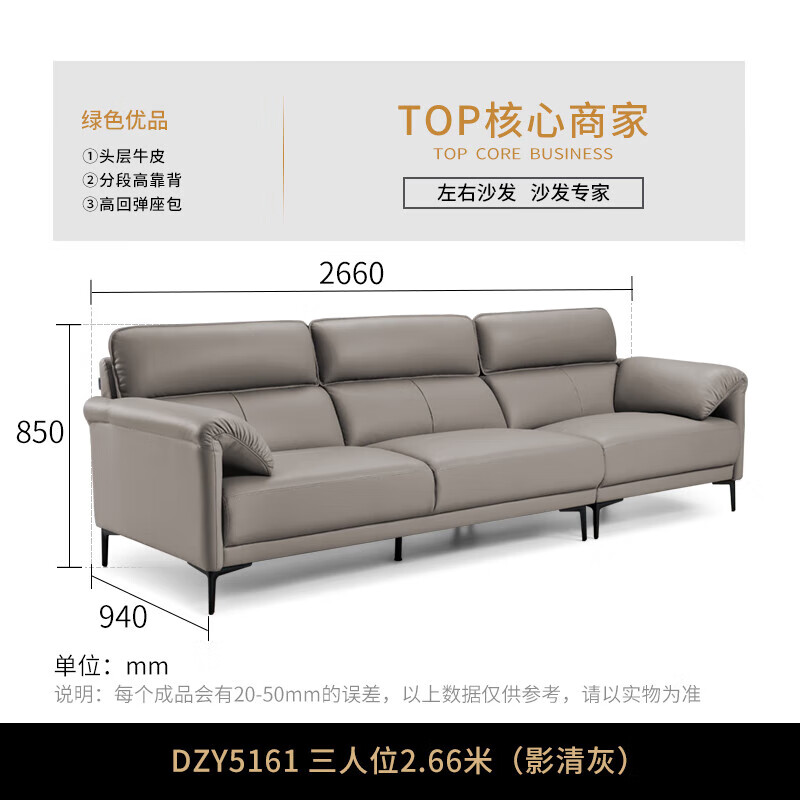 左右沙发现代简约客厅皮艺头层牛皮沙发DZY5161三人位【Z1012影青灰】价格:6699.00元!