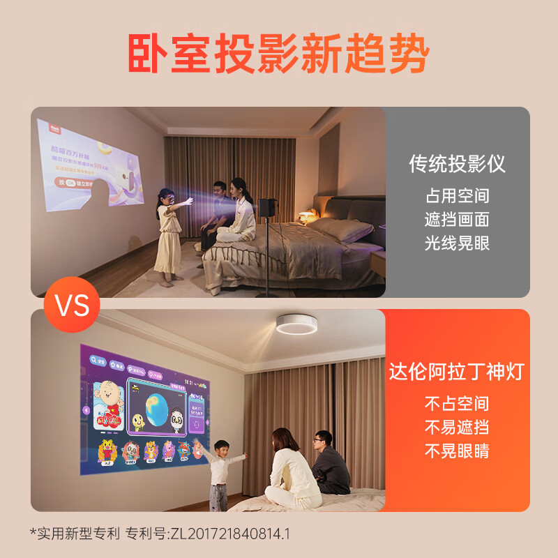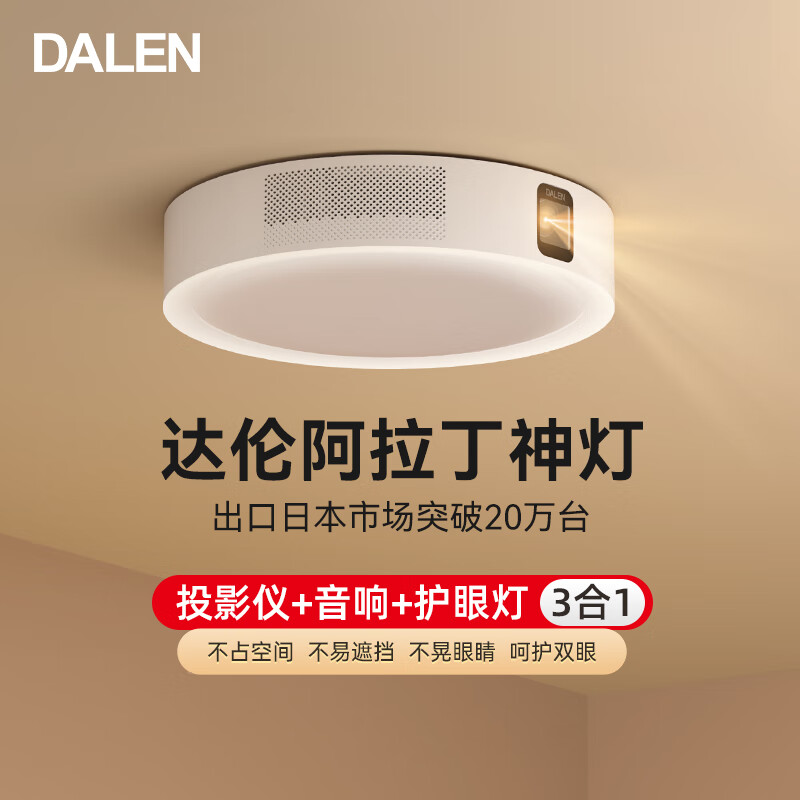 5、达伦阿拉丁神灯!相当可以!整体比较简洁,没有乱七八糟的装饰,显得很大方,音质不错,操作简单,很流畅,语音操控,十分方便,亮度也挺高的,很清晰,对焦方便,直接替换吸顶灯,不担心晃到宝宝的眼睛。可以开心看投影了。音响效果我感觉也很好。