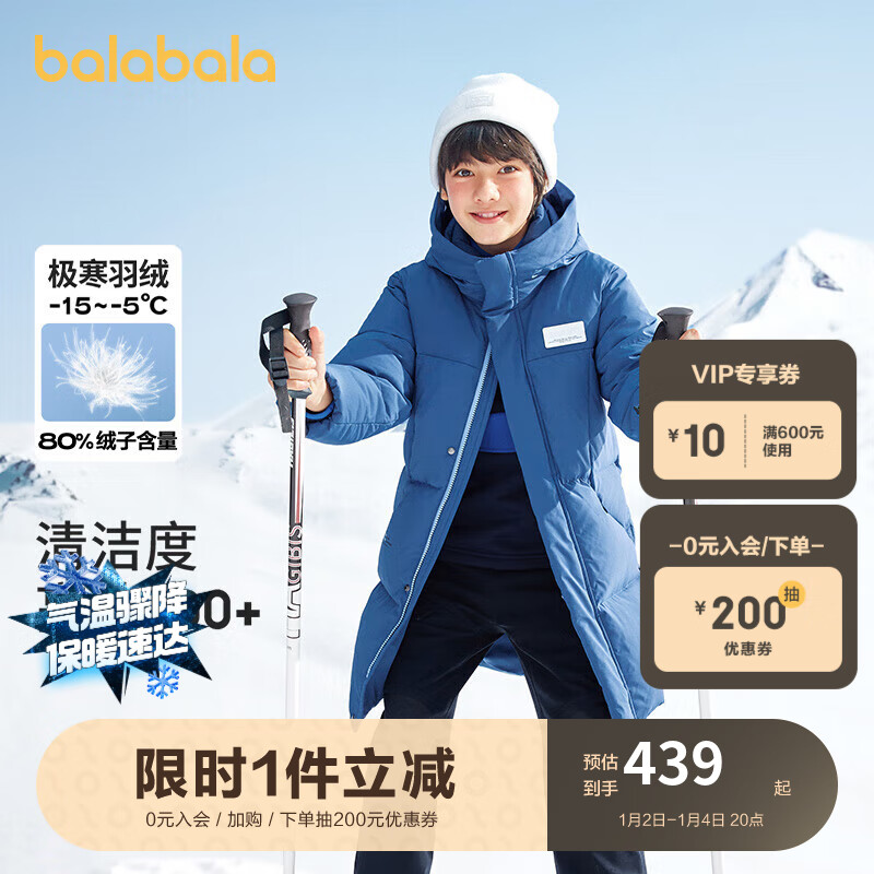 巴拉巴拉儿童羽绒服大童2023款冬季保暖男女童小童长款连帽外套极寒价格:539.00元!