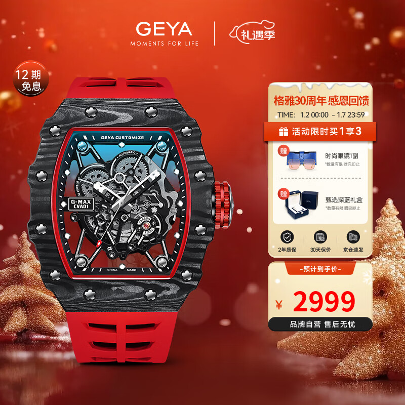 格雅(GEYA)手表男镂空全自动机械表时尚酒桶型手表送男友黑红礼盒款JD78029价格:3679.00元!