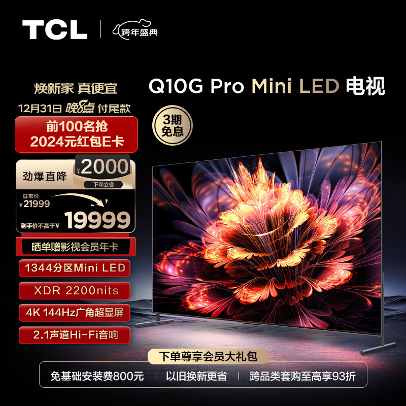 TCL电视 98Q10G Pro 98英寸 Mini LED 1344分区 2200nits 4K 144Hz 2.1声道音响 液晶智能电视机100价格:19999.00元!