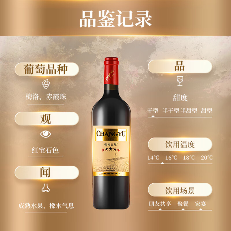 4、张裕五星干红葡萄酒很不错,口感浓郁,回味悠长,非常好喝。而且价格非常亲民,性价比超高,双11有优惠活动,值得下单购买,无论是聚会还是独自还是独自自饮,都是非常好的。包装坚固非常好
