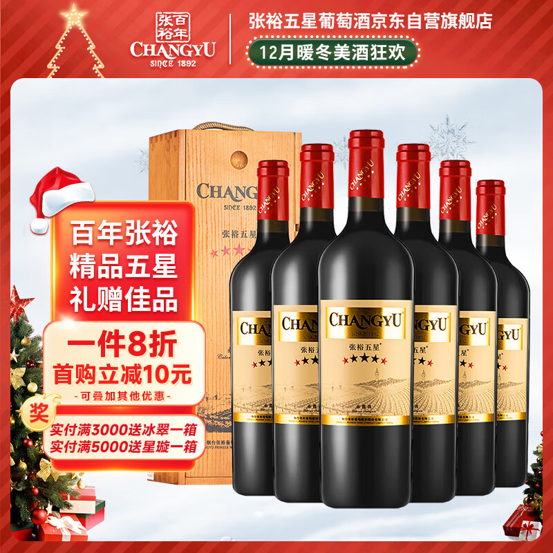 张裕(CHANGYU)五星精品赤霞珠干红葡萄酒750ml*6瓶整箱礼盒装国产红酒 元旦礼物价格:2388.00元!