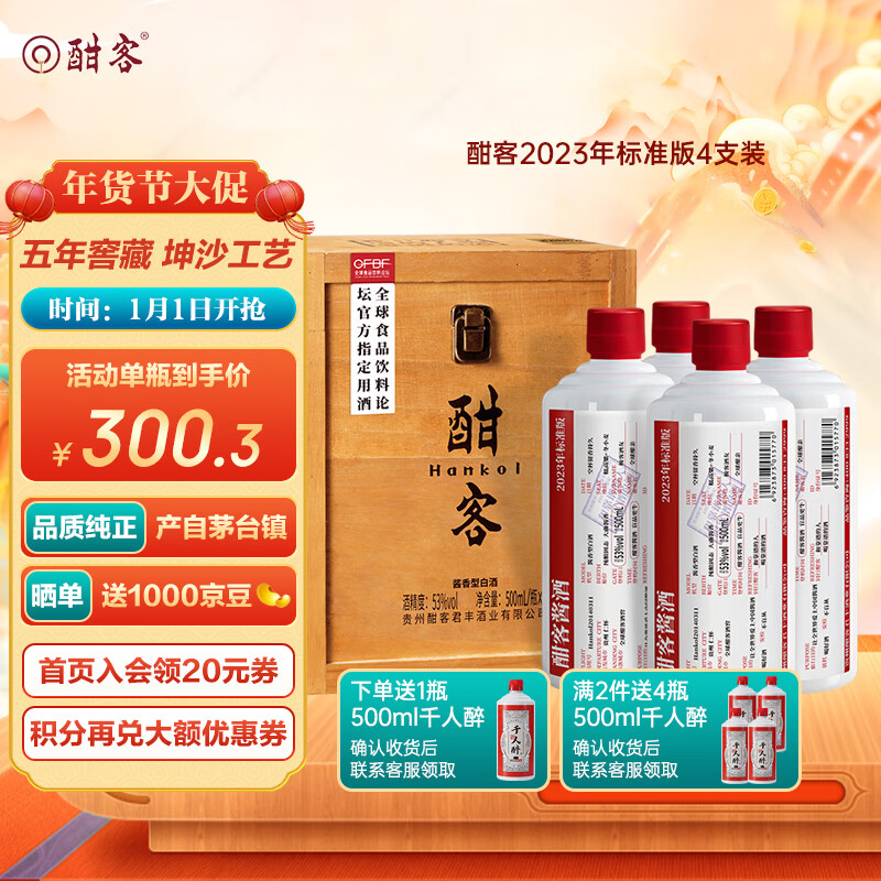 酣客 2023年标准版 酱香型白酒53度大曲 500ml*4瓶 木箱礼盒装价格:1715.00元!