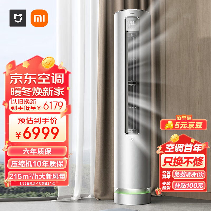 小米3匹 新风空调 新一级能效 变频冷暖 智能互联 客厅圆柱空调立式柜机 米家 KFR-72LW/F2A1 以旧换新价格:6799.00元!