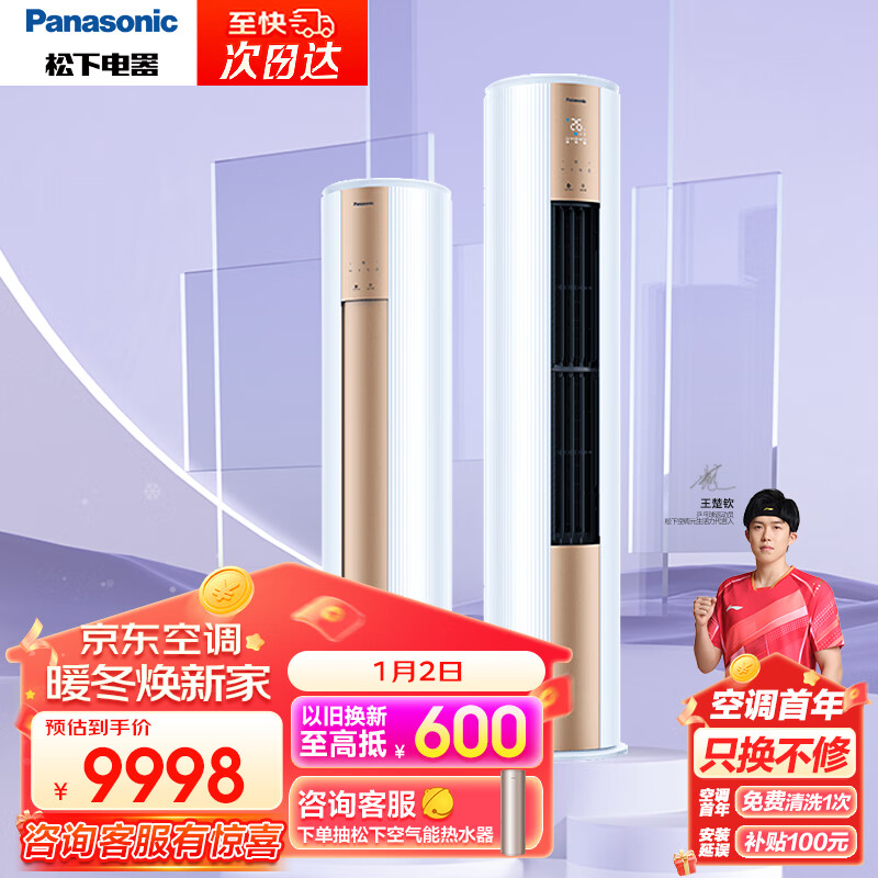 松下(Panasonic)空调 净悦星3匹新一级能效 11米送风圆柱立式柜机客厅空调变频 纳诺怡除菌洁净ZY72F310N 以旧换新价格:9998.00元!
