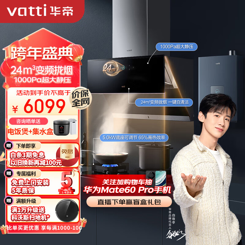 华帝(VATTI)抽油烟机旗舰机王侧吸式变频油烟机燃气灶具热水器家用厨房三件套i11193+72B+254-16(天然气)价格:6099.00元!