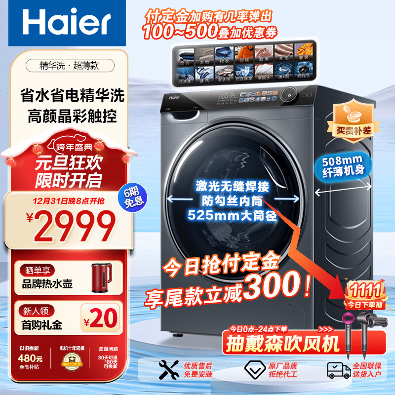 海尔(Haier)028精华洗滚筒洗衣机全自动家用 10公斤超薄平嵌525mm大筒径 变频智能投放 触控晶彩屏 以旧换新价格:2998.00元!