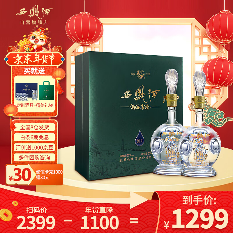 西凤酒 30年52度陕西纯粮食陈年凤香型白酒海窖龄年货送礼盒装500mL*2价格:1299.00元!