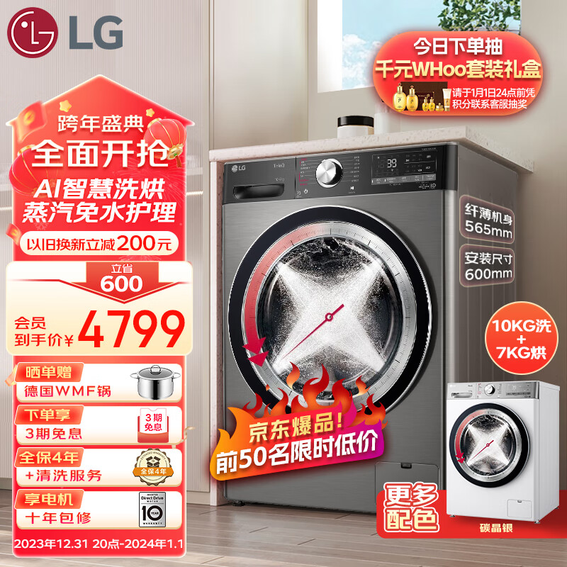 LG小旋风系列 10KG超薄洗烘一体机家用 直驱变频 旋风速净洗 蒸汽除菌 360°速净喷淋 银 FCW10D4PA价格:5299.00元!
