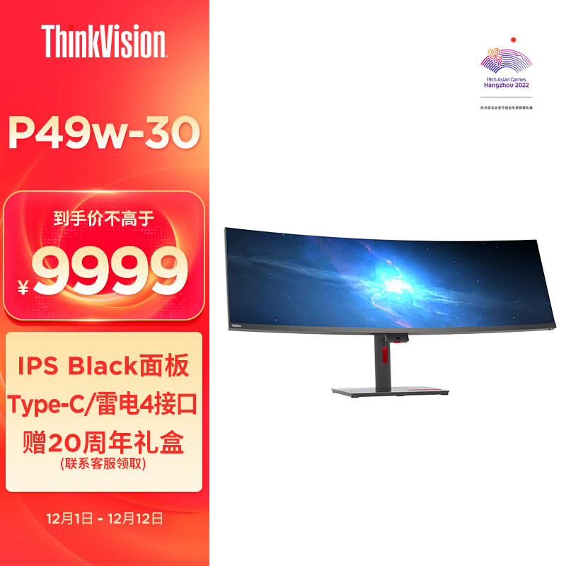 联想49英寸超宽曲面 双2K IPS Black Type-C 雷电4 HDR10 DC调光 音箱 人体工学支架 办公专业制图显示器P49w价格:9999.00元!